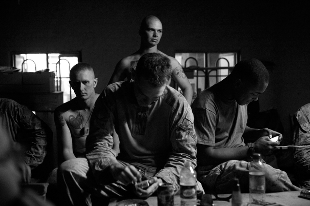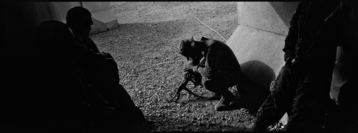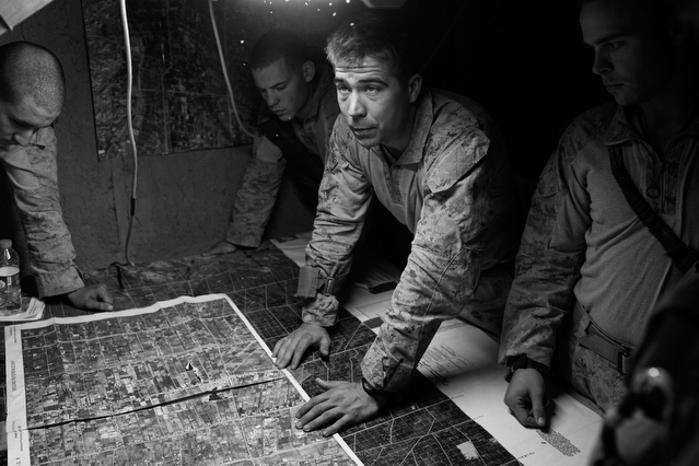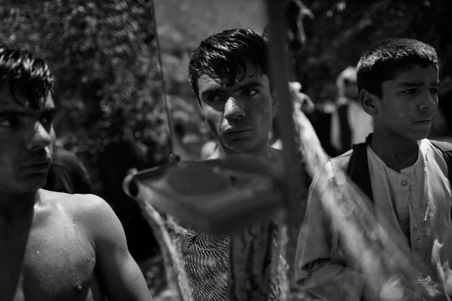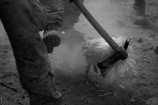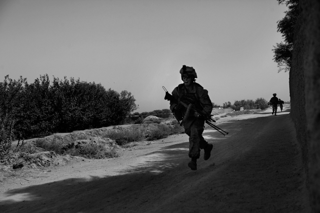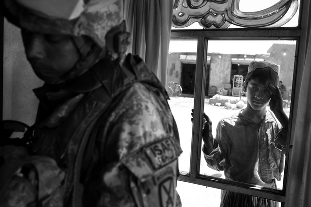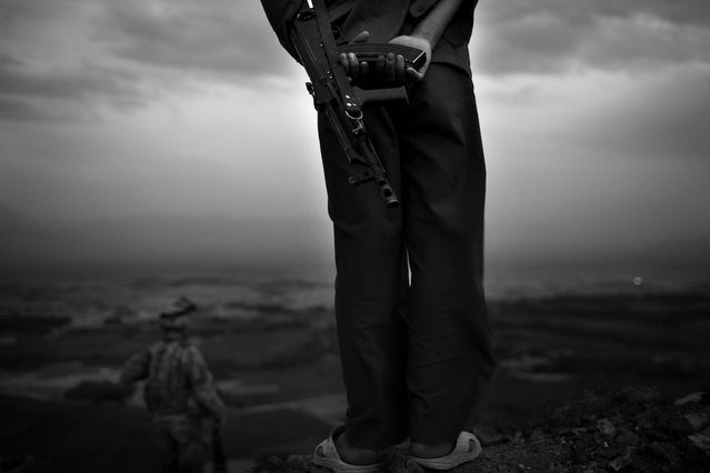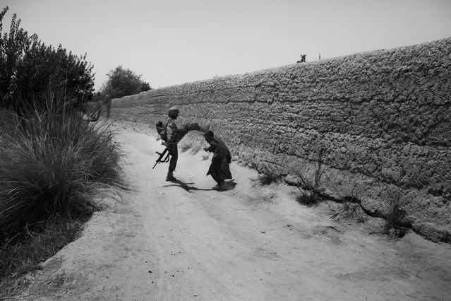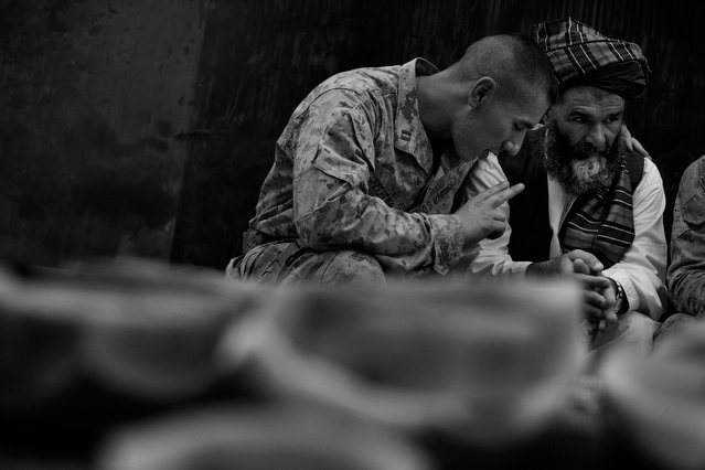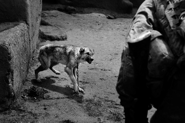 | A search in order to pass a US position, the Onkhai Valley. | A dog lunges at a soldier during a house search in Lachikhel, Tangi Valley. | Afghan policeman at his post, Kandahar City. | A boy watches Spc. Don Ezra Plemmons buy supplies, Sayedabad. | Marines on patrol near COP Turbett, Marjah. | Lt. Stuhler has a heart to heart with Haji Najibullah. | Cpt. Zepeda makes things clear for Haji Bozgul during a shura at COP Turbett. | A villager condemns a US air assault on his community, Lachikhel. | Lnc. Cpl. Stephanie Robertson and an Afghan Police admirer, Kuru-Cherey bazaar, Marjah. | An elderly man argues with Sgt. Timothy Stokes during a patrol in Marjah. | A pair of brothers cry as US soldiers take their father away as a detainee. | Shir Gul washes the cars of Kabulis for money on the shores of Qargha reservoir. | A soldier from the 4/25, 10th Mountain, at a school in Mohammed Agha, Logar province. | Soldiers at rest in the Arghandab Valley. | An Afghan Policeman, asleep outside of Kandahar City. | The Arghandab Valley sweeps to the northwest of Kandahar. | Afghan folks swim in the evening in the Qargha reservoir. | Samiullah, 12, and his father Ismail beg for alms on a footbridge in Kabul. | Afghan women shopping near the Kut-E-Sangi market, Kabul. | Cutting a flip into the pool, Paghman. | Day laborers share a breakfast of tea and naan, Kabul. | An evening swim in one of the US built canals, Marjah. | Two boys, and a reflection, Paghman. | Afghan men swim and roughhouse around the pool. | Lightbulb store in the Old City, Kabul. | Motorcycle pride. | Abdul Mohid and other laborers in their transient hotel after a long day. | Elders listen to an appeal for volunteers for a local militia in Zabulat, Wardak. | Afghan police wait out a rain storm in a cellar during an operation in the Tangi Valley. | Afghan soldiers watch the disposal of one of their destroyed vehicles, Marjah. | Photos of Taliban found on a house raid, Chor-Cherey, Marjah. | An empty seat next to a house, a sign of bad atmospherics, Marjah patrol. | Women and children gather as Marines search their compound. | Afghan soldiers on patrol in the Tangi Valley with flowers in their hair. | Patrolling in sandals on a hill above Logar Province. | Night falls on JSS Commanche, Tangi Valley, Wardak Province. | Staff Sgt. Zamora leads a fire team on patrol in Marjah. | 1st Platoon Fox Co. kills a chicken the hard way for dinner at Chor-Cherey bazaar, Marjah. | Marines wrestle in the evening, Chor-Cherey bazaar. | Torgusen, Panilaitis, Vittitow and Person gather after the evening patrol, Marjah. | Waiting out a mortar attack at FOB Terra Nova in the Arghandab Valley. | Spc. Branch shoulders an AT-4 before a night patrol, Babur, Arghandab valley. | Sgt. Stokes conducts a pre-mission brief before a patrol, COP Turbett. | Heading out to man an all night checkpoint, COP Babur. | Deployment reading rests on a wubby in the Arghandab valley. | 2nd. Lt. Hall with an improvised rocket aimed at his base, Logar Province. | Sgt. Thomas Burke conducts a search during an air assault in the Tangi Valley. | Pfc. Tyler Schell on patrol at dusk, Tangi Valley. | Cpl. Manuel Jimenez, an hour before the blast. | Doorway to a home, Marjah. | Patrolling from COP Turbett, Marjah. | Coming up out of cover, Kuru-Cherey patrol. | An Afghan Army soldier attacks a civilian after a firefight, Marjah. | Lnc. Cpl. Mullins fires a LAW rocket at insurgents during a fight in Marjah. | A pull string, attached to a live IED left after a firefight, Chor-Cherey, Marjah. | Cpl. Matthew Griffith struggles to communicate without an interpreter during a house search. | A letter from Marine Lnc. Cpl. Kaleb Lacy's fiance, Chor-Cherey. | Lt. Col. David Flynn's helmet and gloves, with the Blackheart insignia, the Arghandab Valley. | Lnc. Cpl. Kaleb Lacy runs toward the shooting after a firefight breaks out near Chor-Cherey bazaar. | Cpl. Eric Hopp rushes to save Cpl. Manuel Jimenez after he is hit with an IED on patrol in Marjah. | Cpl. Jimenez is carried across the canal. He lost his left arm in the blast. | Marines protect Jimenez from the rotor wash during his medevac, Marjah. | Lt. Jeff Turner, left, and Lt. Kevin Kilmartin during a briefing at COP Turbett. | Soldiers salute at the ramp ceremony for Sgt. Patrick K. Durham and Spc. Andrew J. Castro killed in Babur. Kandahar Air Field. | Lt. Matthew Stuhler sits up with Afghan soldiers after they lose seven of their own, Marjah. |