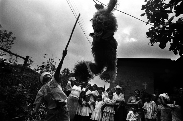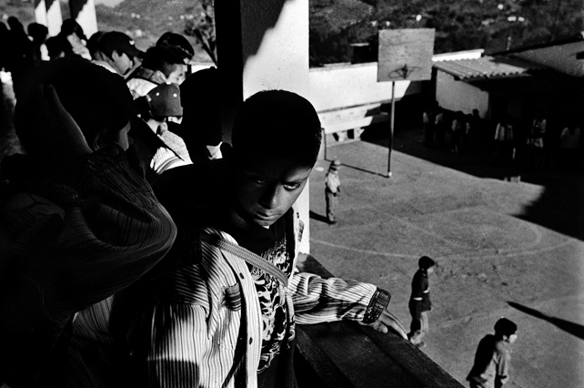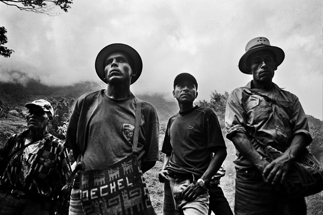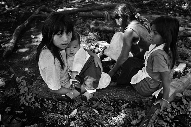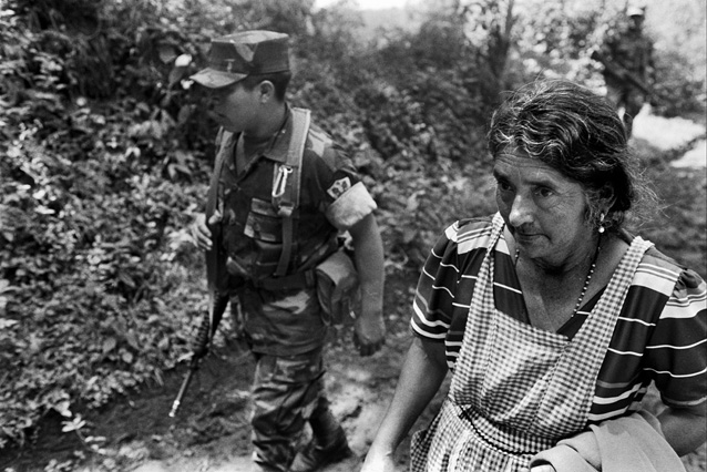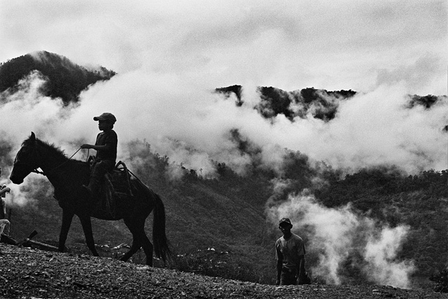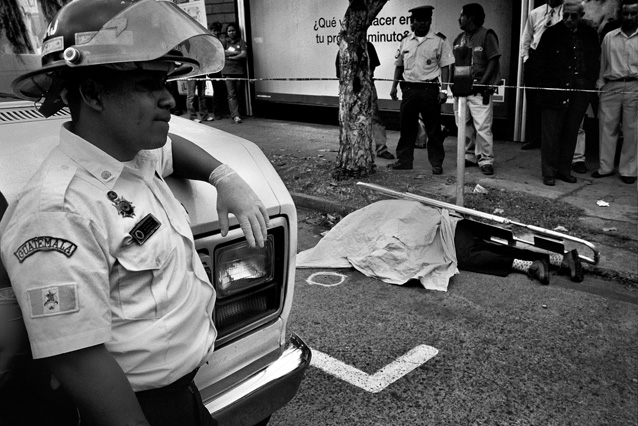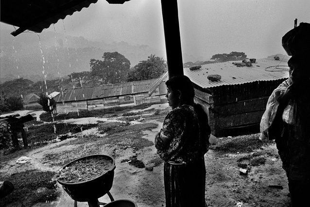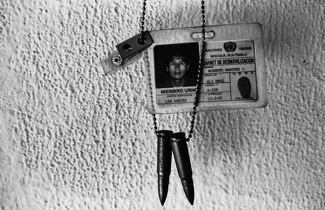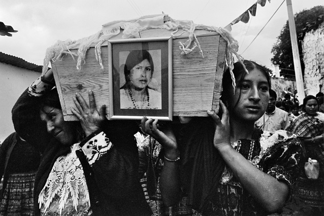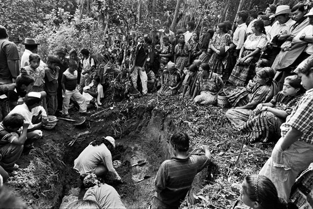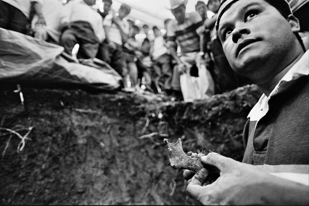 | Children dressed as clowns beg in Guatemala City. | Morning breaks, Santa Anita la Union. | Melissa does her hair before leaving for school. | Rainy afternoon in the Ixil triangle. | In the highlands of Quiche. | Augustina weighs her child in a bakery scale. | Campesinos search for the graves of their relatives, Estrella Polar. | Wismer swings at a pinata on his birthday. | Listening to the forensic anthropologists. | Fernando's UN demobilization card. | Anthropologist Danny Guzman holds a jawbone during an exhumation, Comalapa. | Exhumed skull in a former army base. | Families of the disappeared watch the exhumation. | Moruners carry the coffin of a victim of the war, San Pedro Jocopilas. | Burning a rat infested mattress. | Murder victim, zone 10, Guatemala City. | The blind accordion player, Sixth Avenue. | Marina Sinar sings and prays for her missing son. | Women cry over the body of their slain father. | Carnival night, Todos Santos. | Otilio waits with his friends for school to start. | Boys watch the funeral for a murdered priest. | Watching telenovelas at home, back from Oakland. | A woman is escorted by soldiers from an evicted settlement, Finca El Maguey. | Squatter, Nuevo Palmar. | Sisters sit in the ruins of their former home. | A squatter builds his shack from plastic sheets, Rancho Tres Hermanos. | Burning the fields during the sugar cane harvest. | Valerio, a guerilla for 17 years of his life. | Running the horses for the Day of the Dead. | Watching the drunks. | Night falls on zone 1, Guatemala city. | Women walk by a wall of wrecked police trucks. | Victims of the social cleansing. | Parishioners mourn the death of their priest. | President Berger and bodyguards. | Evening in the shantytown, El Mezquital. | Victim of the riot at El Hoyon in the morgue, Escuintla. | Maria and the disappearance of her son. | Members of the Mara 18, El Hoyon prison. |