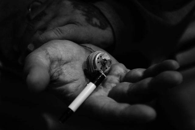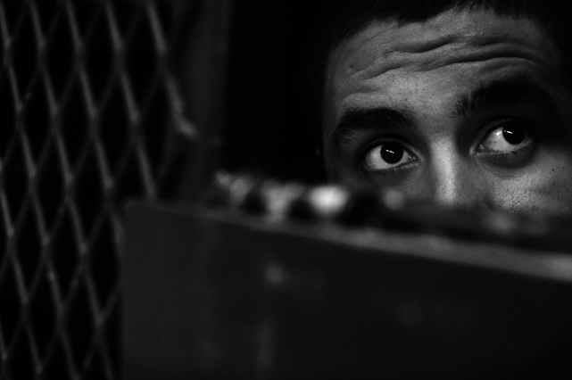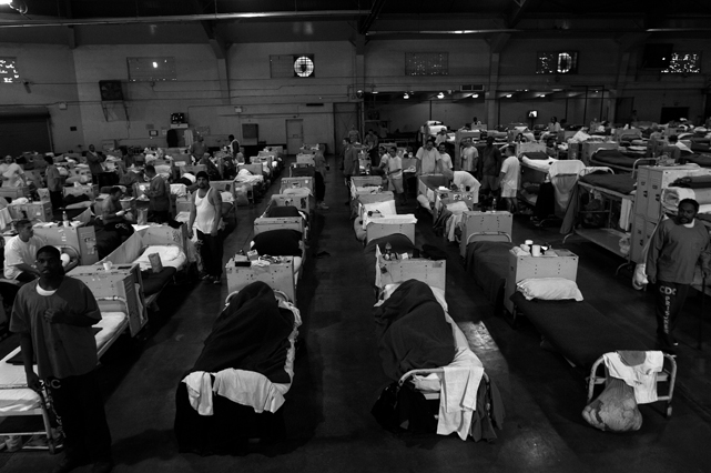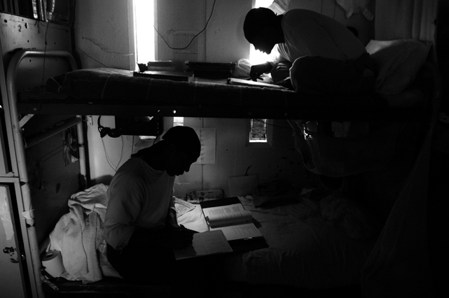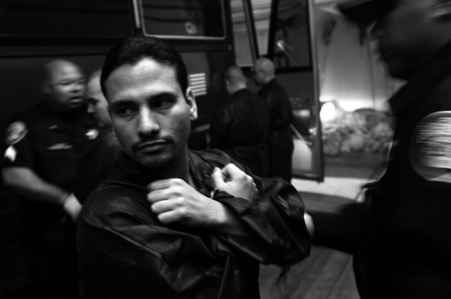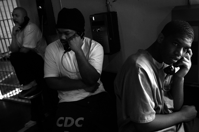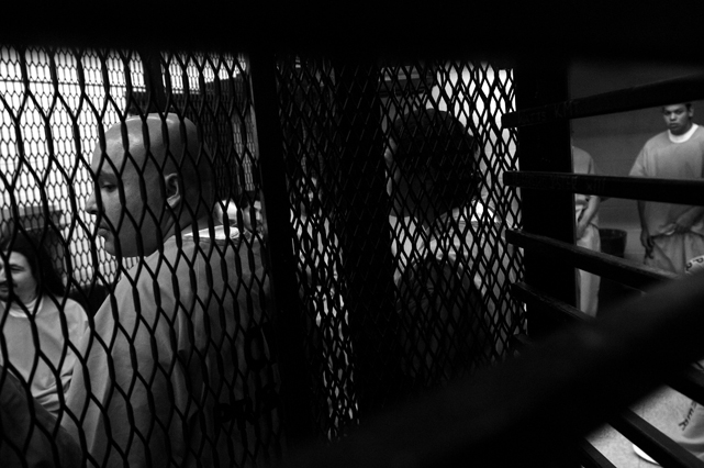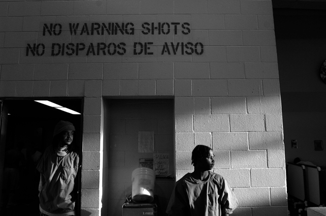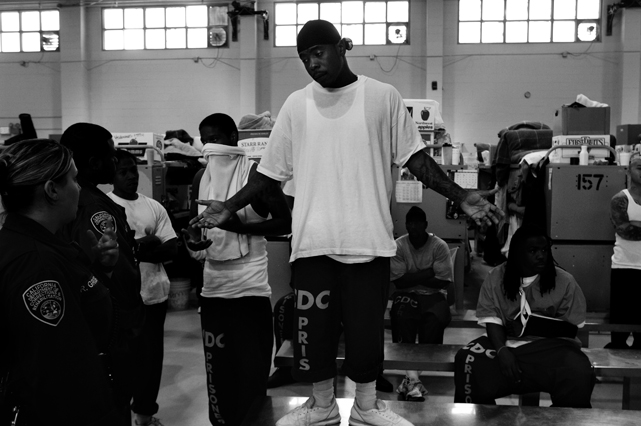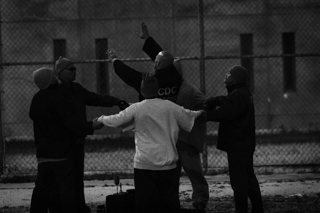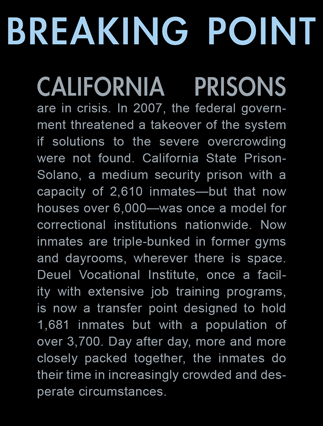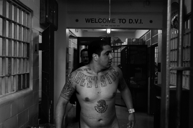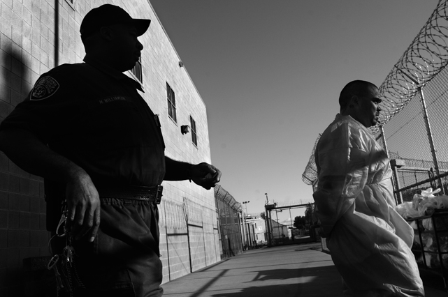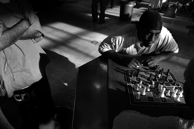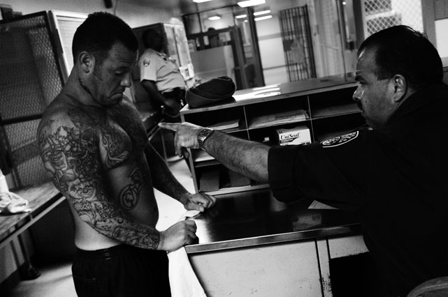 | A guard prepares to shackle an inmate before transfer at Deuel Vocational Institute, a California State Prison used as a transfer point. | Clouds roll over California State Prison- Solano in Vacaville CA. | Inmates mill around a dorm in a former gym at DVI. | A guard escorts an inmate being transferred to another facility. | Newly arrived inmates listen to instructions at CSP Solano. | Inmates talk on payphones in a dorm. | A prisoner argues with guards in a Level Three dormitory. | Inmates at CSP Solano study high school courses and read the Koran on their bunks. | Jerry Archer walks between the bunks in H or "Hell" dorm in CSP Solano Prison. | Inmates play a game of chess in Level Three "H" dorm. | An inmate watches the yard through a shattered window. | White supremacist inmates perform a Wiccan religious ritual at dusk in the yard in CSP Solano. | A "shank," or homemade prison weapon, lies beneath a prisoners' pillow. | Inmates pass the time outside the shower room. | A prison tattooist holds a homemade tattoo gun. | An inmate has his tattoos reviewed by a guard before paroling. | Inmates await transfer at DVI. | A video monitor records a dorm. | An arriving prisoner is strip searched | An inmate awaiting transfer peers out from a holding cage at Deuel Vocational Institute. © 2007 Discovery Channel |
