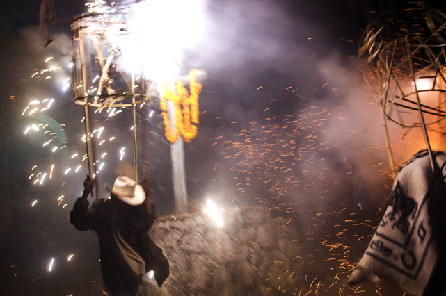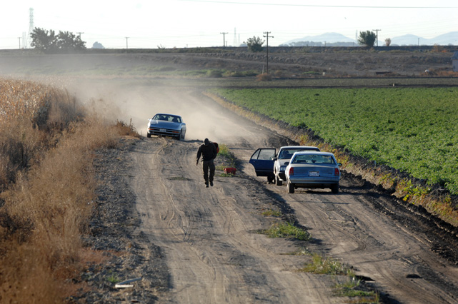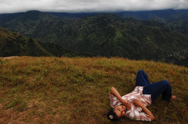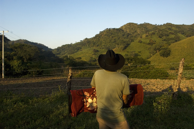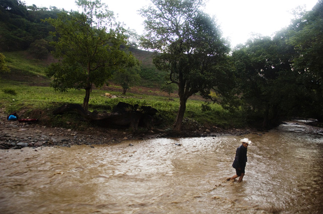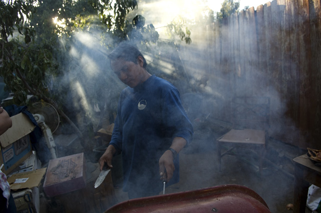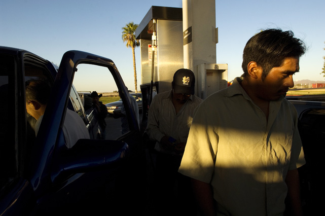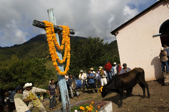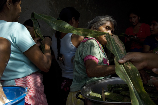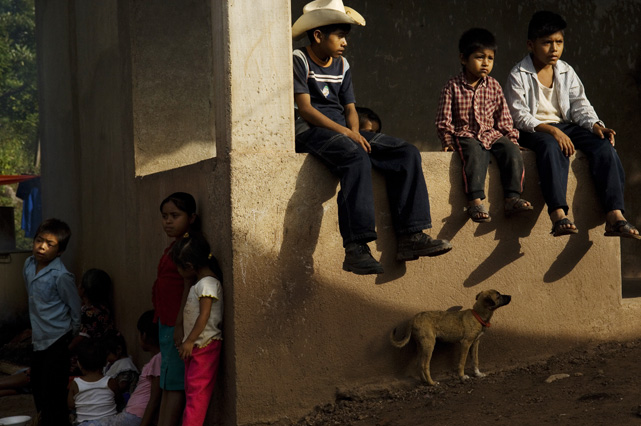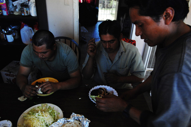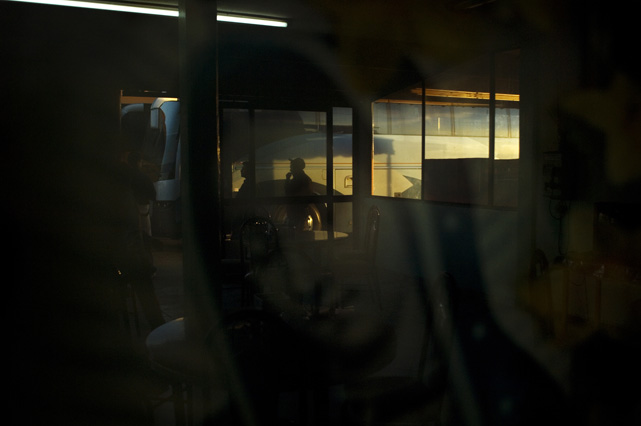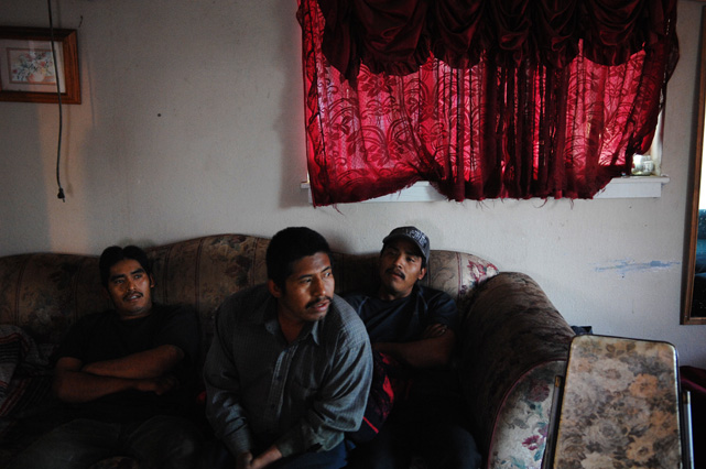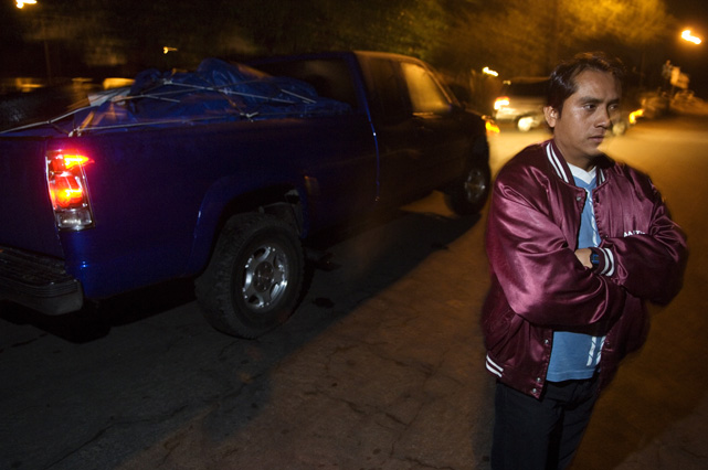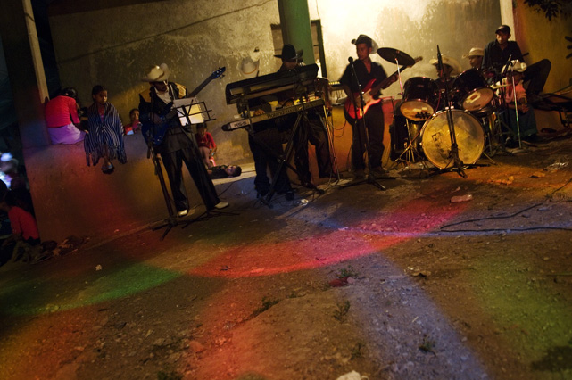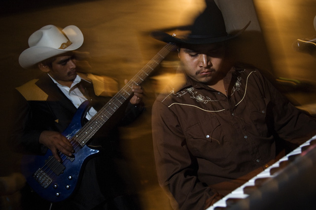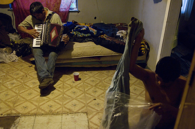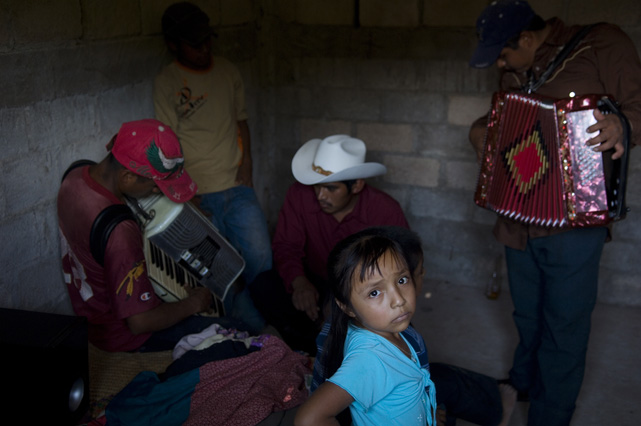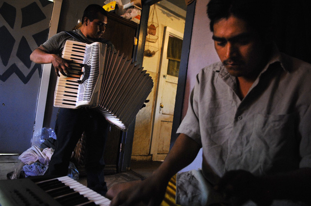 | Constantino Fermin plays accordion before work. | Santos, Constantino, and Nicasio eat dinner after a day in the fields. | Santos in his room. | Arriving in the fields. | Constantino and Nicasio rehearse together after work. | Sunday afternoon barbeque. | Waiting to pick tomatoes. | Santos stays behind as the brothers leave for Mexico. | Gas station, Arizona. | Bus station, Ciudad Juarez. | Efrain Fermin, reflected in the Virgin Mary. | Nicasio looks over the hills of his home state, Guerrero. | Crossing the river to Acojtapachtlan. | Constantino talks to his son for the first time in his life. | Cooking tortillas over the fire. | A niece watches the brothers rehearse for the festival. | Edgar Fermin, 2, takes a bath behind his house. | The village of Atojtapachtlan, mid festival. | Local boys watch as the town celebrates. | Constantino leads a cow around the church as a blessing. | Women make tamales for the festival. | Villagers celebrate San Lucas with fireworks. | The Fermin brothers, aka Los Diferentes del Sur, take the stage. | Constantino and Nicasio play the dance. | Efrain rests in the hills above town the day after the festival.