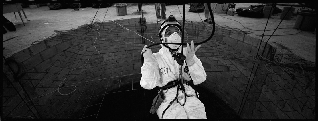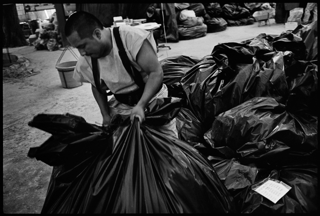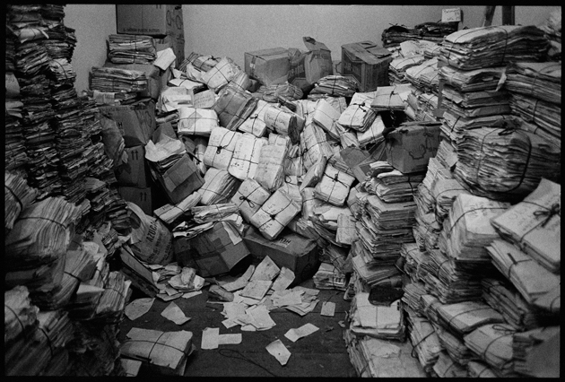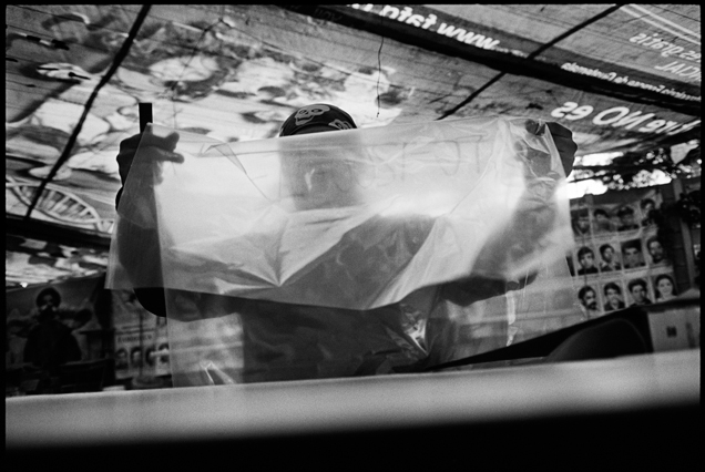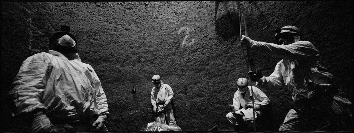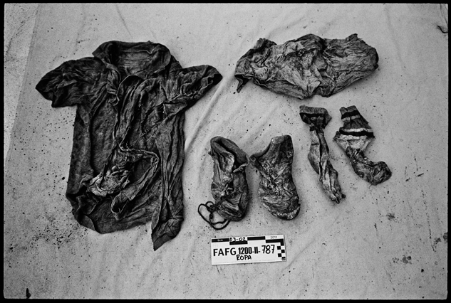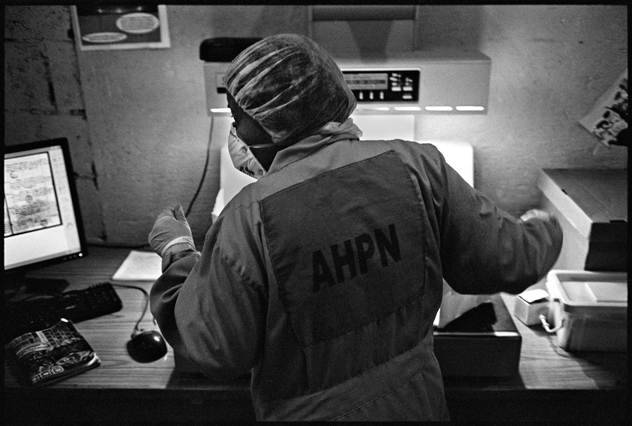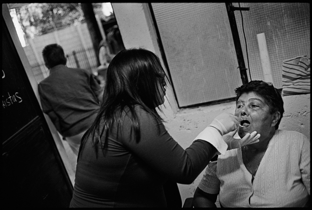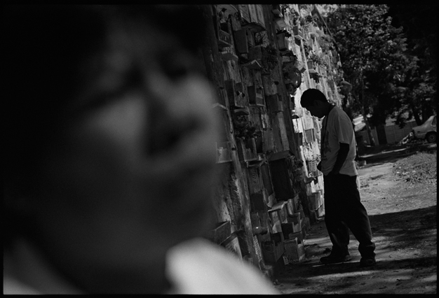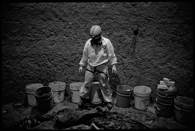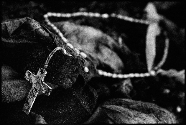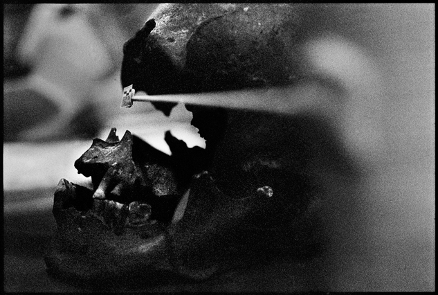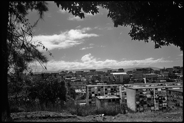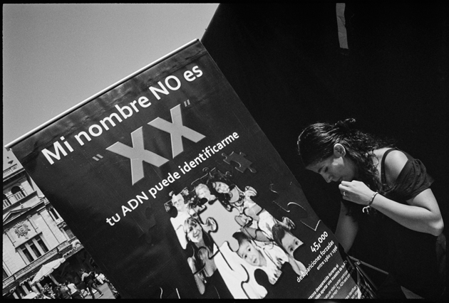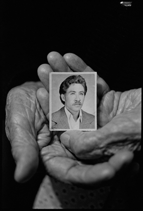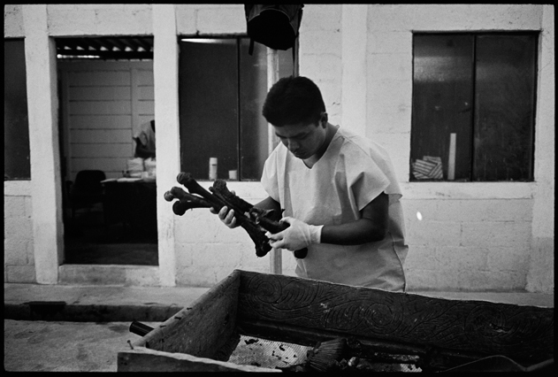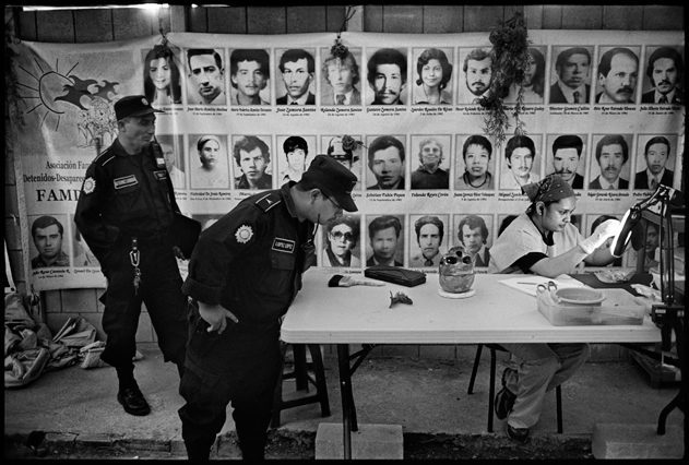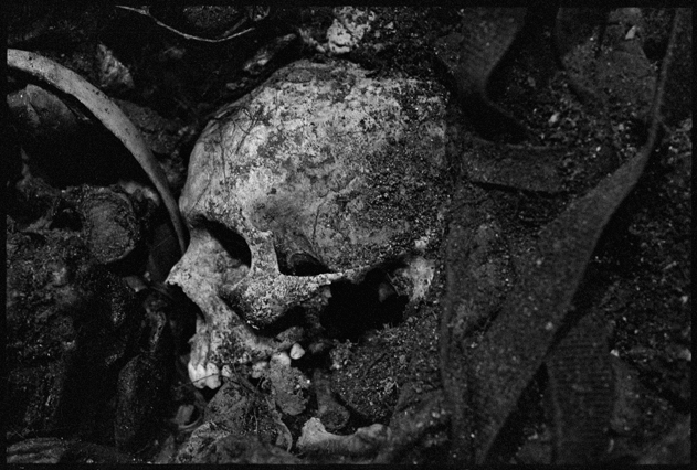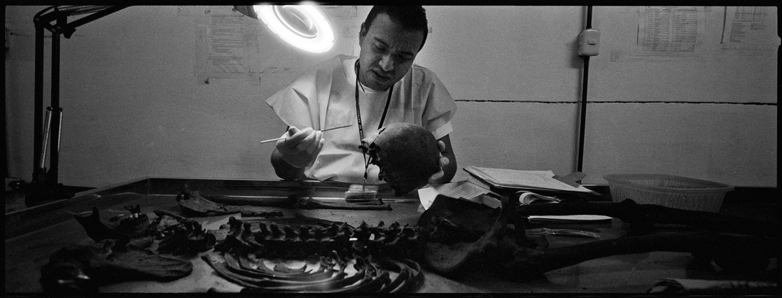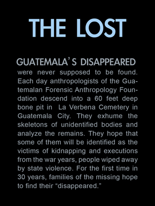 | Angeles tries in vain to reassemble a skull at La Verbena. | Above workers and anthropologists above the ossuary. | The exhumation from down inside. | Ramiro looks down at the hundreds of remains. | A skull emerges from the pile of bones in the pit. | Sara Poroj Vasquez lost her husband to disappearance in 1984. | Sara and her son at La Verbena where she hopes she will find her husbands remains. | Sara on her roof. She makes tamales to sell in the street to make ends meet. | Visitors to La Verbena come and go through the front gate of the cemetery. | Jessica takes a DNA sample from a family member of a disappeared woman in hopes of finding a match. | Jorge Mario Barrios examines case #1200-2776. | Susanna Sanchez analyzes a skull while police watch. | Kat descending into the ossuary. | Pigeons over the cathedral in the Plaza Central. | The public campaign to gather DNA samples from the living. | The faces of the disappeared on the walls of Zone 1. | Esther Herrarte lost her son Jorge Alberto from her living room in 1983. | Esther does the dishes. She hopes Jorge's remains will be found at La Verbena. | A clip from the newspaper sits on Esther's kitchen table. | Vinicio drags a bag of remains to be re-interred. | Esther shops at a local market near her home. | Esther and her son Edgar walk out the same door of their home that her son Jorge was abducted through in 28 years ago. | The skull of an unidentified person, FAFG case ##1200-2776, who probably died from a gunshot to the face. | Bernabe prepares a bag to hold remains from the ossuary. | Sorting unmatched bones at the exhumation site. | A rosary discovered among the remains. | Clothing from a skeleton is catalogued and photographed. | Vinicio holds on as he stares down into the pit. | Julio Solorzano Foppa, who lost his mother to disappearance in 1980, at home in Guatemala City. | Ester Herrarte holds a portrait of her son Jorge. | Don Julio with a poster of his disappeared mother, Alaida Foppa, a prominent Latin American feminist and poet. | Rows of niches filled with the dead at La Verbena. | A worker scans documents at the historical police archives, where researchers hope to find evidence of forced disappearance. | One of the last rooms at the historical police archives to be catalogued that hopefully holds clues to police killings. |