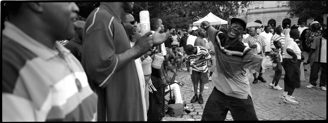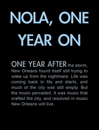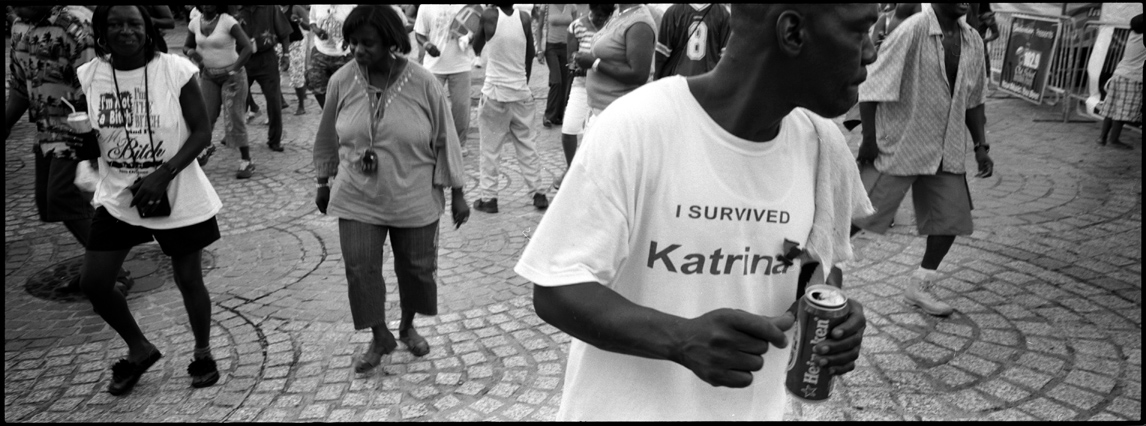 | The Mighty Mississipi. | Collapsed. | Dancing at Satchmo Fest. | Oak trees standing still. | Demolishing the Lower 9th Ward. | Watching, waiting. | Still crushed, one year on. | "Won't you stand, Stand by me." | Second Line procession. | Days come fast and they go so slow, Jackson Square. |